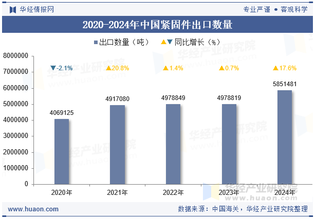 華經(jīng)產(chǎn)業(yè)研究院數(shù)據(jù)顯示:2024年中國(guó)緊固件出口數(shù)量為5851481噸,與2023年相比增長(zhǎng)了872662噸,同比增長(zhǎng)17.6%。