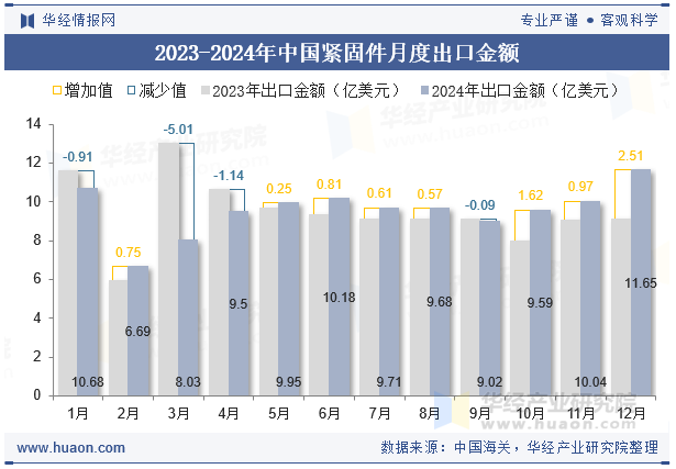 分月度來(lái)看,2024年中國(guó)緊固件出口金額于12月達(dá)到峰值,為11.65億美元,與2023年同期相比增長(zhǎng)了2.51億美元,同比增長(zhǎng)27.6%,去年同期出口金額為9.14億美元,累計(jì)到2024年12月出口金額為114.54億美元,累計(jì)同比增長(zhǎng)3.3%。
