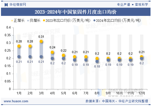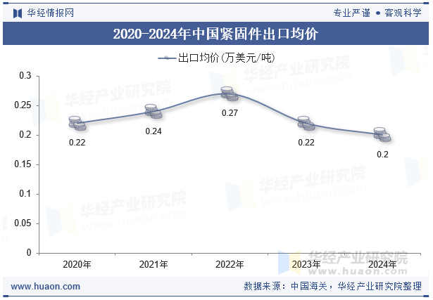 2024年中國(guó)緊固件出口均價(jià)為0.2萬(wàn)美元/噸,與2023年相比減少了0.02萬(wàn)美元/噸,2023年中國(guó)緊固件出口均價(jià)為0.22萬(wàn)美元/噸。