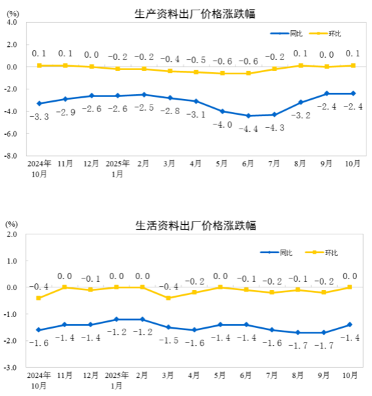 2025年10月份,全國工業(yè)生產(chǎn)者出廠價格同比下降2.1%,降幅比上月收窄0.2個百分點;環(huán)比由上月持平轉(zhuǎn)為上漲0.1%。工業(yè)生產(chǎn)者購進(jìn)價格同比下降2.7%,降幅比上月收窄0.4個百分點;環(huán)比上漲0.1%,漲幅與上月相同。1—10月平均,工業(yè)生產(chǎn)者出廠價格比上年同期下降2.7%,工業(yè)生產(chǎn)者購進(jìn)價格下降3.2%。
